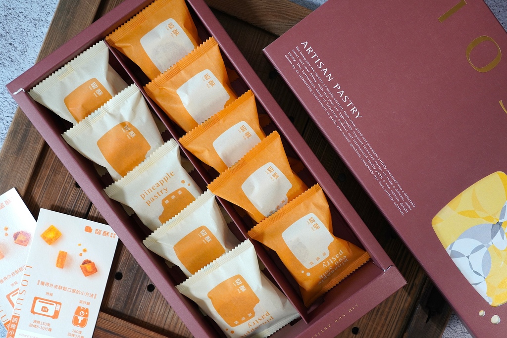 留酥LIO SUU酥餅專賣產品的包裝設計也讓小金十分的喜愛,這次主要的產品有「慢熬冬瓜鳳梨酥」「鹹香鴨仁鳳凰酥」兩種風味,所以在禮盒的設計上也用了不同的顏色來區分。