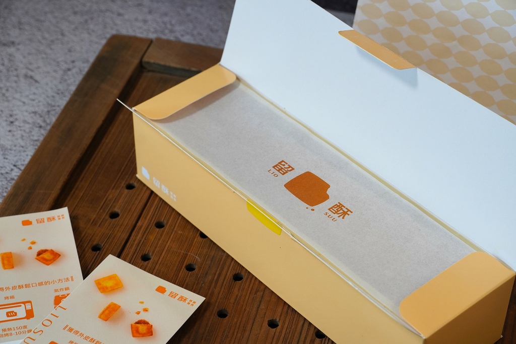 留酥LIO SUU酥餅在包裝的每個小細節也都非常的重視,像這每日現烤祼裝的酥餅最後還會舖上一張印有美美LOGO的紙片,在開盒的一瞬間也要讓大家有滿滿的視覺享受。