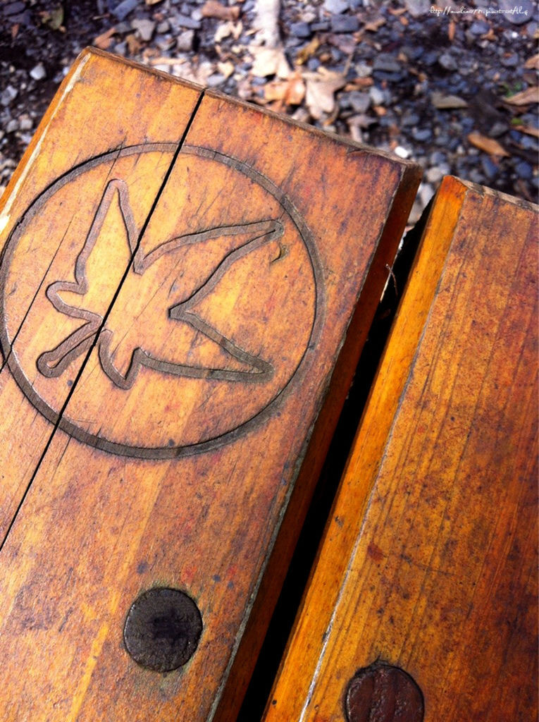 走得好累,也沒楓葉...大夥只好坐在椅子上抱怨一番; 結果發現椅子做的蠻用心的~