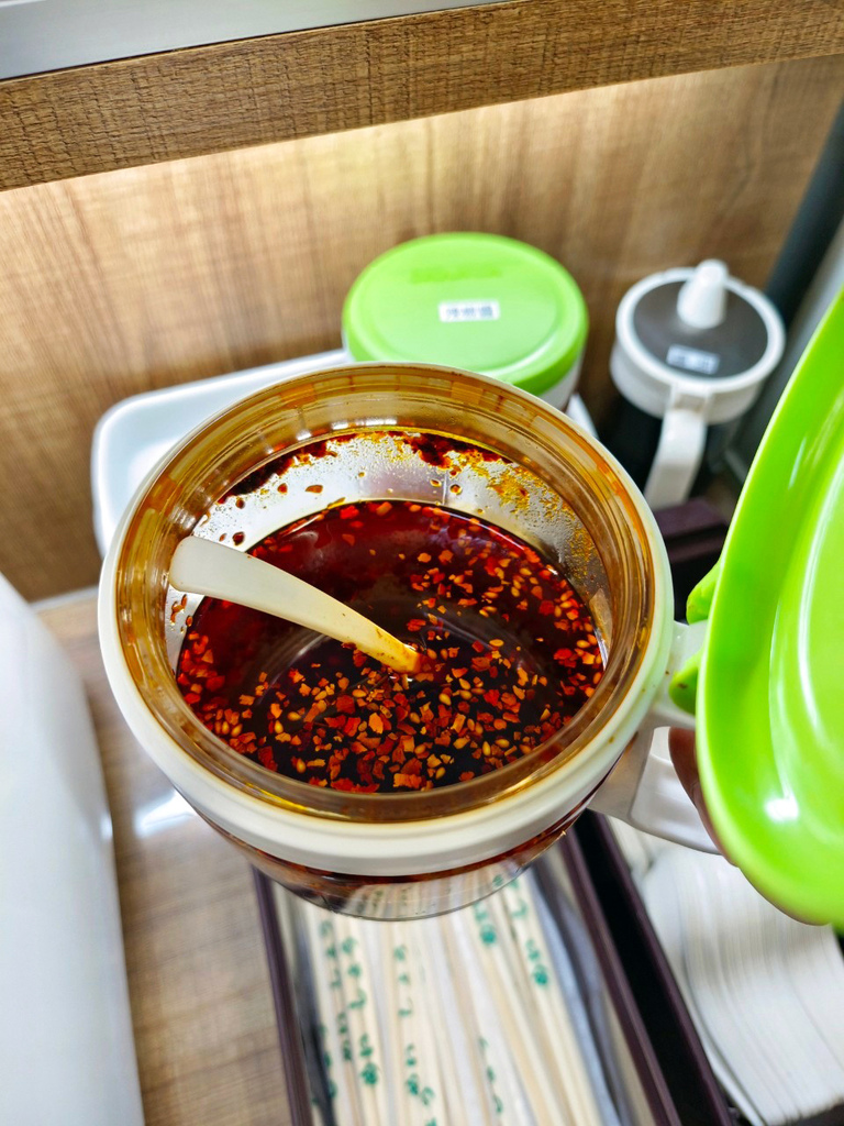 ▼帶我來的經理說這是張家牛肉麵老闆自己炒製的辣油,味道很香很提味,推薦我一定要試試看