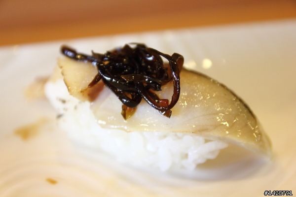 第二貫為微微炙燒過的日本金目鯛,佐以一些檸檬皮,有著淡淡的油香與甜味,口感仍屬綿軟。