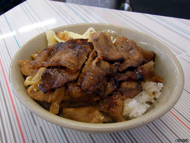 永樂燒肉飯:上層是切片的燒肉,下面還有筍絲、嫩薑。燒肉的份量,因約三大片的里肌薄片片切的份量(猜),不多也不少~至少吃得夠. 烤肉片的滋味,不用多說,就是下飯,尤其,肉的口感(厚度)恰如其份地好入口。除了肉片的醬汁味有點鹹外,這碗燒肉飯,還真得跟印象沒差太多!