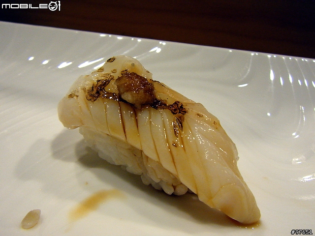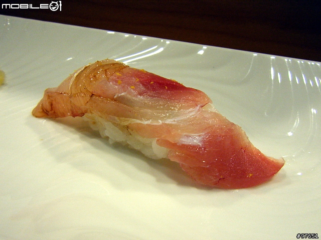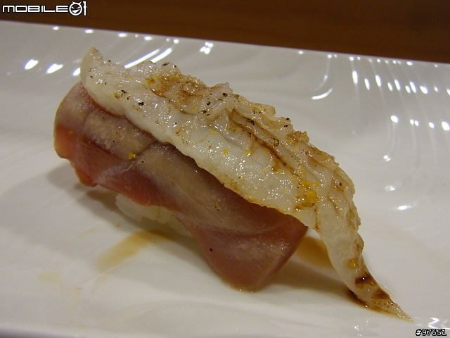 印度黑鮪toro + 鰈魚緣側:這一貫可真豪華,toro部位,再搭微炙後的鰈魚緣側,簡直是奢侈的享受吧!但也有壞處,上頭的油脂味道,掩蓋了黑鮪本身的鮮~