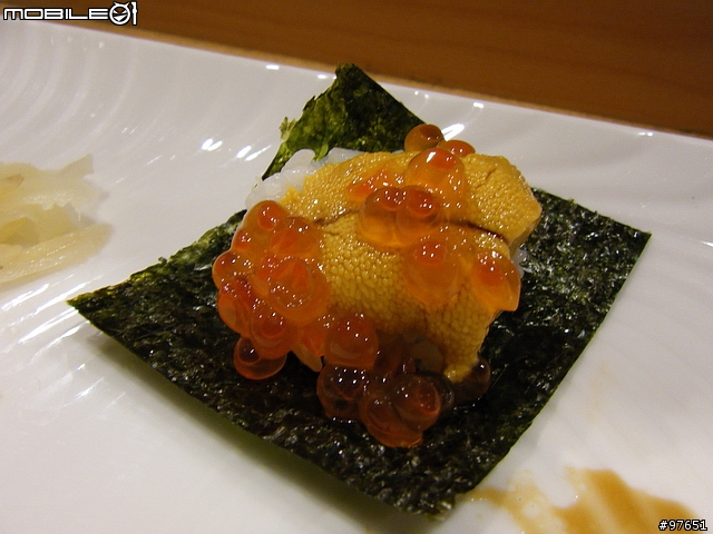 海膽鮭魚卵卷:除了前頭的炙青花外,這一品海膽鮭魚卵,可是挾著大海的氣勢,一波波地鮮甜,攻擊著味蕾。但吃這種,還是喜歡筋子的口感!