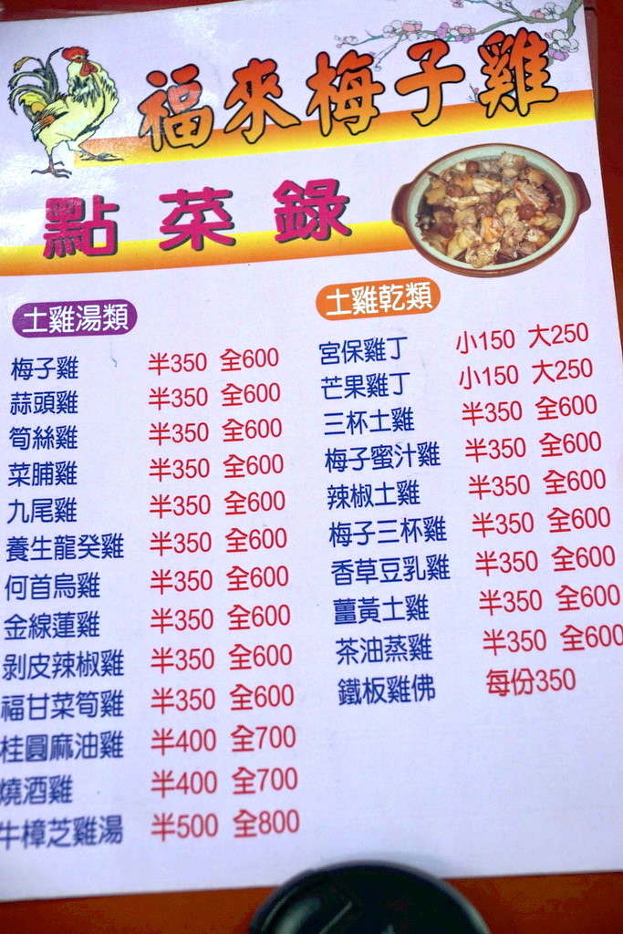 菜單,第一頁主要是雞料理,分為湯類與乾類;翻頁後則是有山產、魚蝦、素食、名菜、蔬菜與主食的項目,也有合菜可以讓客人直接點