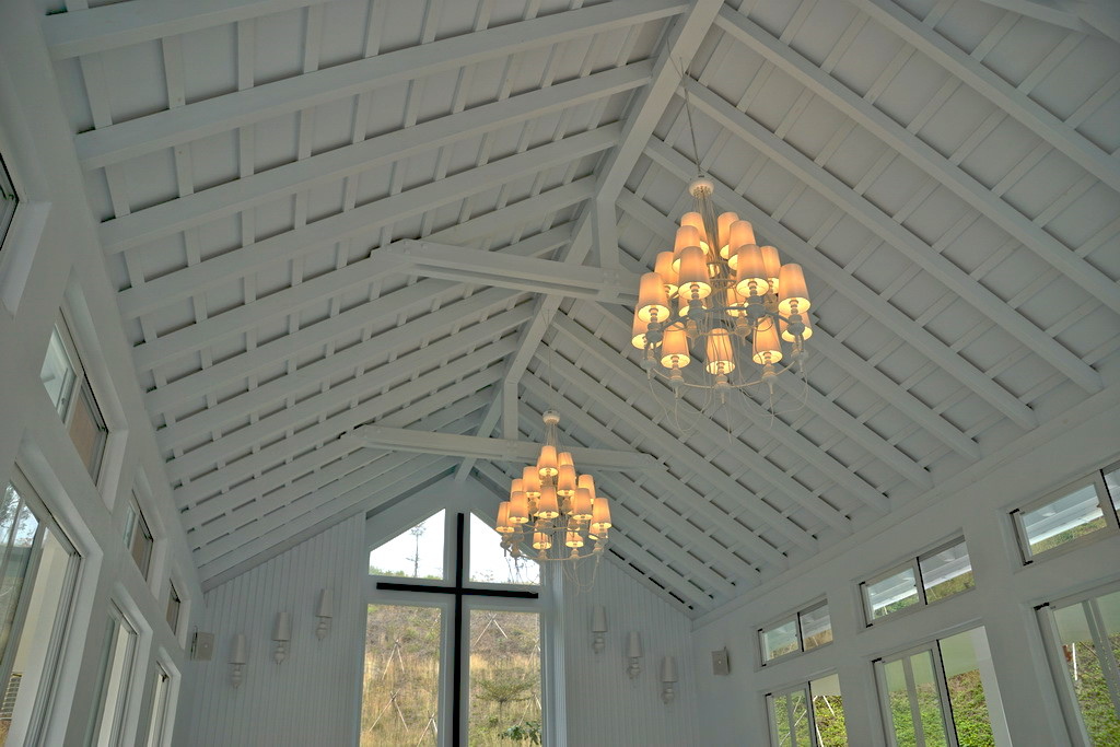 白色教堂的四周是以長條形落地窗構成,上方有三盞多層的吊燈,正中央是牧師的講台與十字架