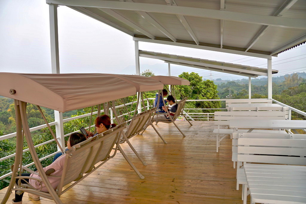 展望台也提供了桌椅休憩,還有雙人的吊椅可以坐看山景