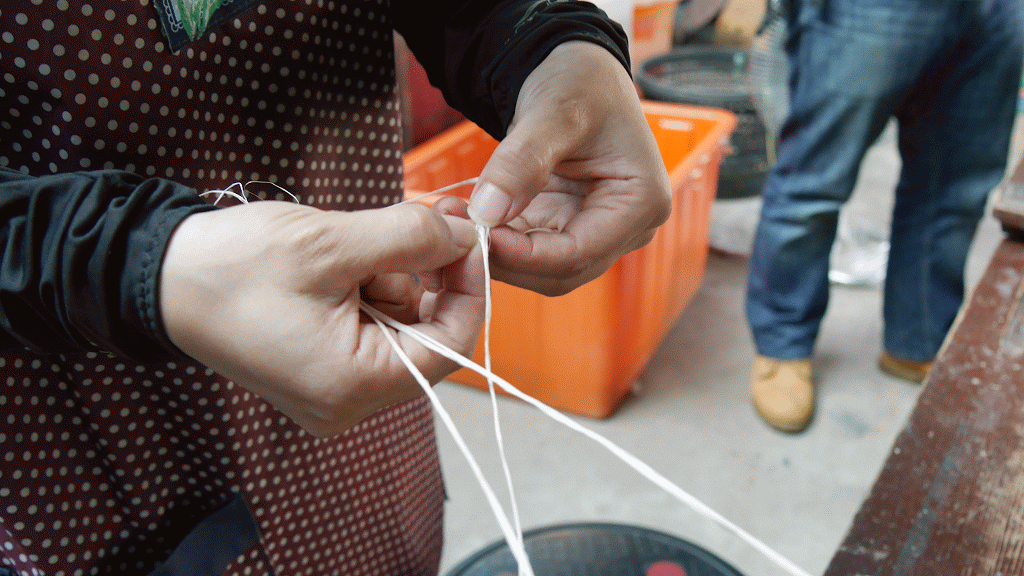 ▲從葉子取下的鳳梨纖維,需經過水洗利用手指甲去除殘留的葉肉。如果葉肉沒刮除乾淨,有可能在水洗過程,造成纖維打結或曝曬時發霉,使纖維無法使用。水洗乾淨後,就需要進行曝曬。