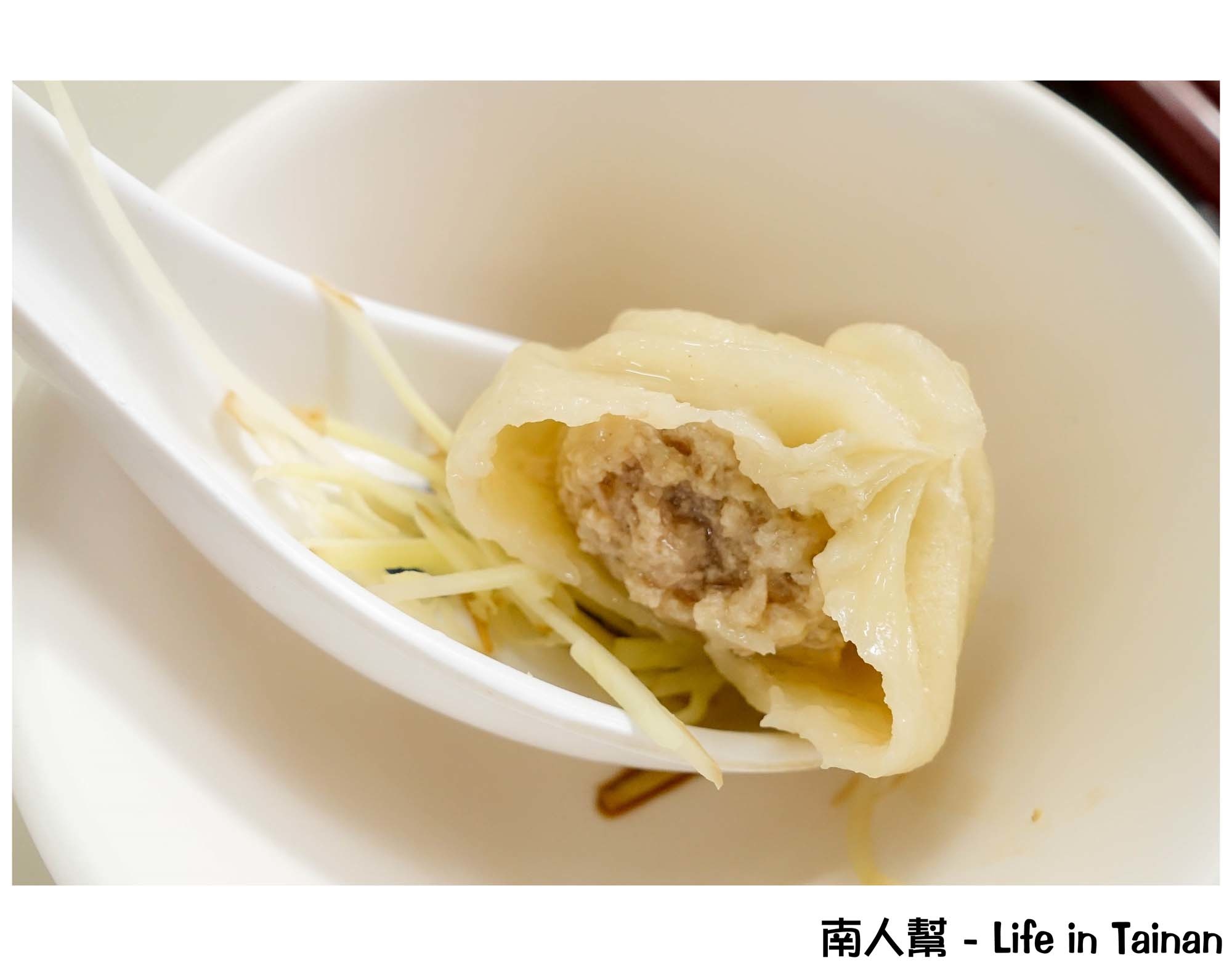 在蒸籠布底下擺滿了松針,主要是蒸時讓松針增加小籠包的香氣,每個小籠包一口剛剛好,皮不是薄到吹彈可破那種,帶點微微的厚度,裏頭包了滿滿的餡料和湯汁,單吃不會過鹹,也可以搭配薑絲和醬油吃。