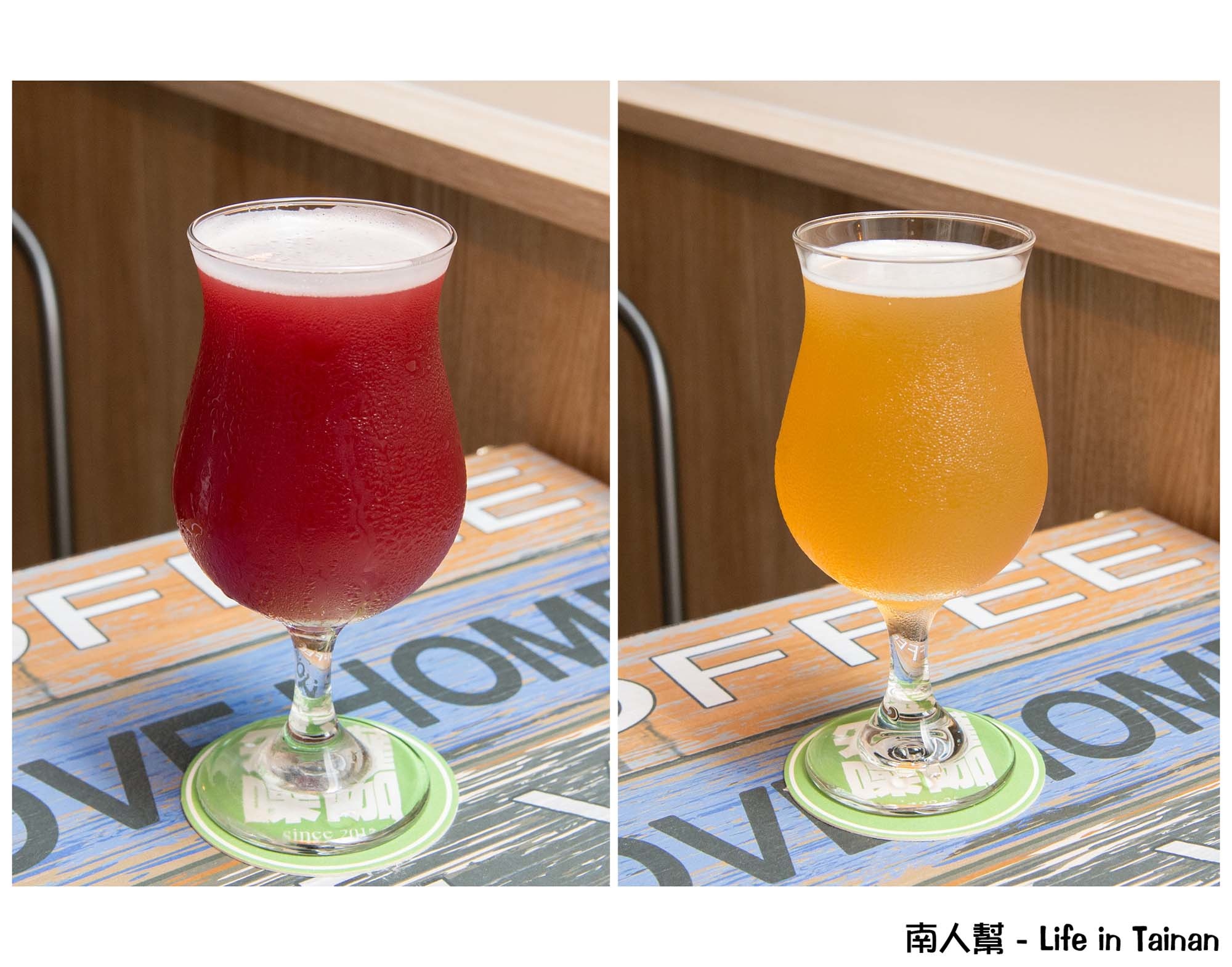 比利時風味生啤酒『豪格蜜桃(220元/380CC)(280元/480CC)』和『康尼森櫻桃(220元/380CC)(280元/480CC)』,左邊這杯是康尼森櫻桃,酒精濃度3.5%,聞起來和喝進嘴裡帶著濃濃的果香,使用西歐頂級櫻桃Hesbaye的櫻桃,以康尼森以自家白啤酒為底添加天然櫻桃果汁,依造傳統古法釀製,沒有一般女生不愛的啤酒味道,屬於果香濃但酒精味沒那麼重的酒。