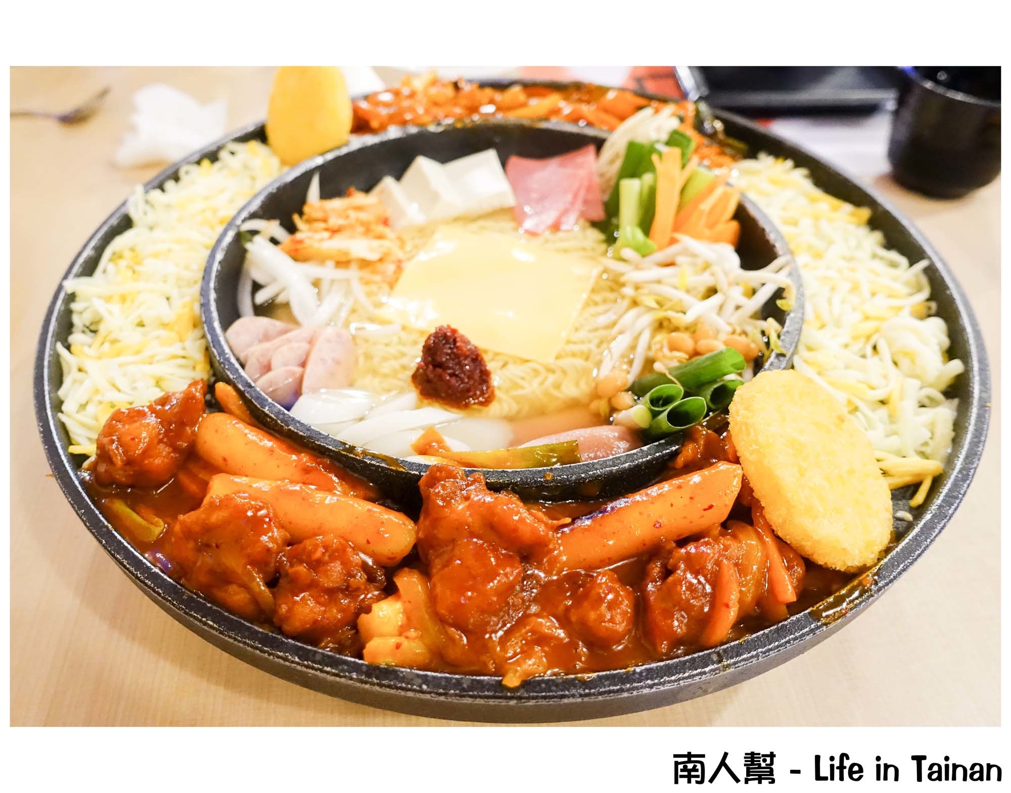 內圈是起司部隊鍋,部隊鍋就是一種西式雜鍋,源自於1950年代韓戰過後的議政府市,當時這裡設置了許多駐韓美軍,由於物資短缺,美軍就把基地內剩餘的香腸、罐裝火腿及午餐肉、起司等食材,被附近的居民拿來搭配辛辣醬當作火鍋,後來這道起司部隊鍋就變成了韓國在地的美食,一直到現在還很受歡迎,部隊鍋湯頭是不辣的,辣來自於上頭那坨辣椒,不敢吃辣的就把它拿掉就不會辣了,韓國的麵就是標榜Q,再加上起司片融入到鍋物中帶點起司的香氣,搭配的飯可以選擇白飯或炒飯。