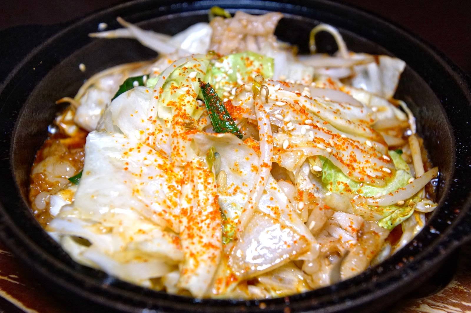 醬燒和牛牛腸,以小鐵鍋製作的燒物,放了大量的高麗菜