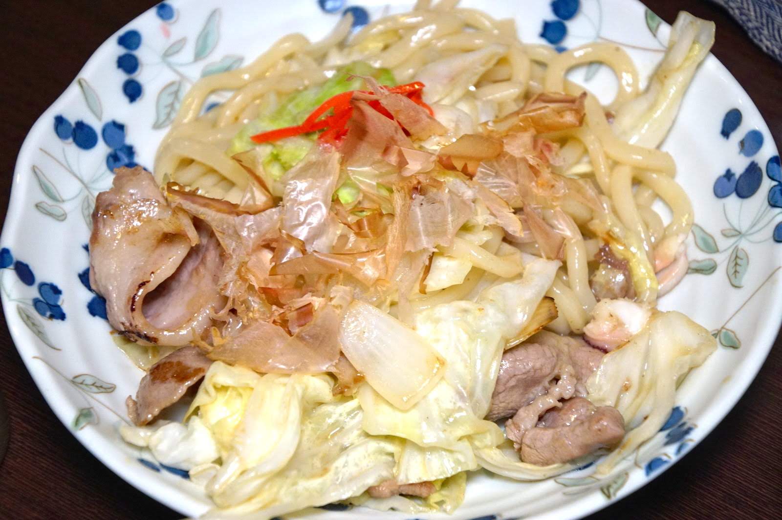 炒烏龍麵,日式料理常見的主食,有大片的豬肉以及大量的柴魚片點綴