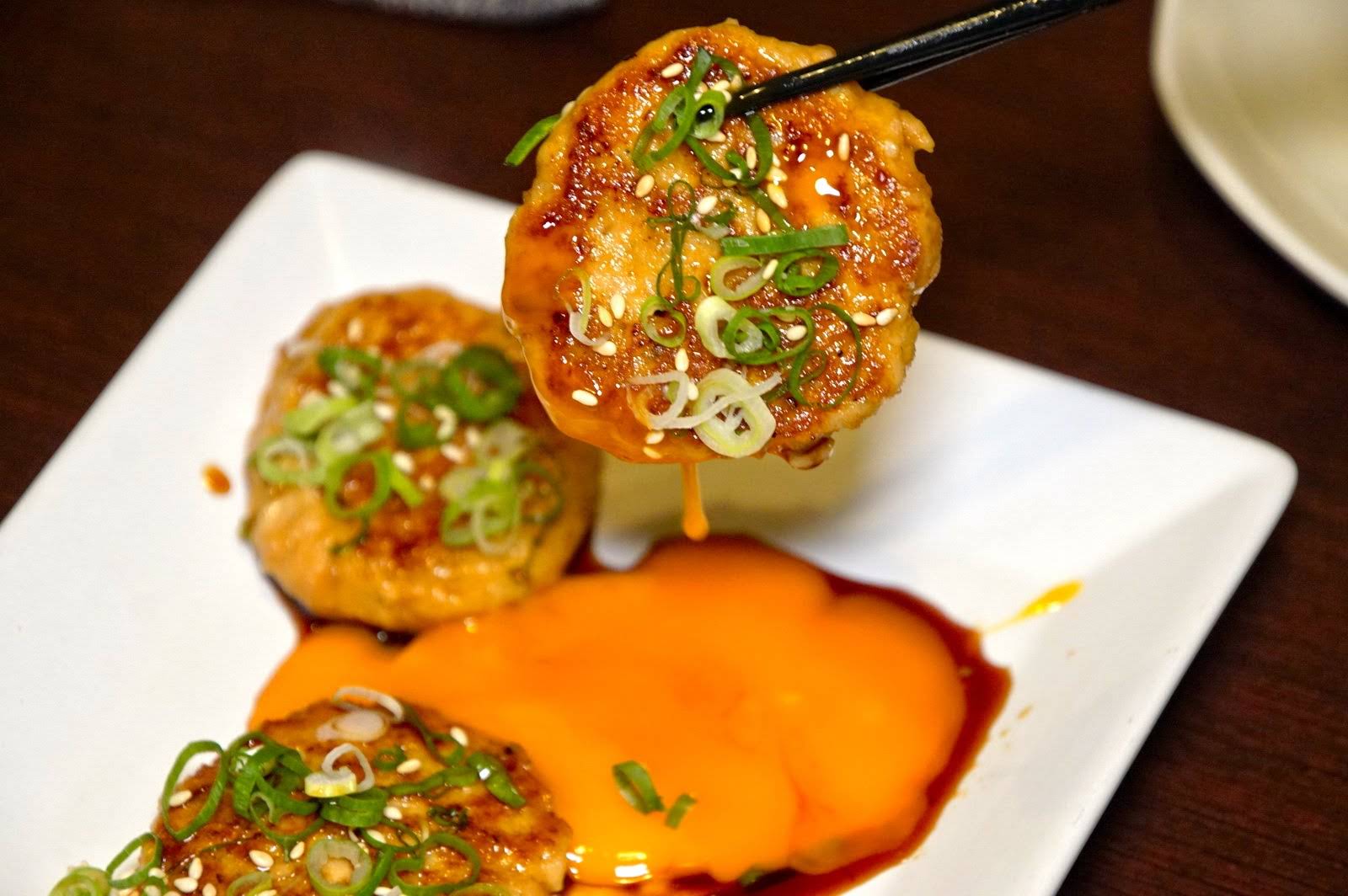 雞肉丸子,形狀有點像漢堡排,中間有生蛋黃可以沾
