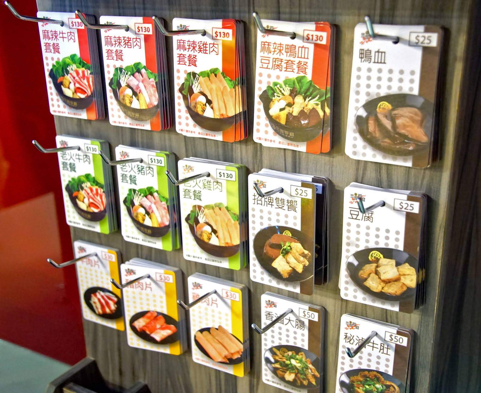 側面掛著牌子,上頭有套餐、肉片以及熟食類餐點,要點餐時直接把牌子一起交給店家即可