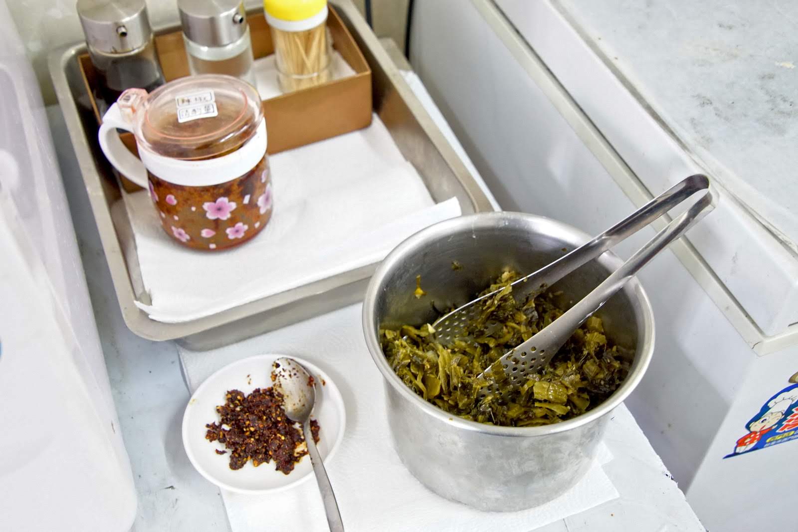 醬料區,除了有很多人吃麵必加的酸菜之外,還有老闆很自豪的辣椒、油潑辣子與牛油辣椒