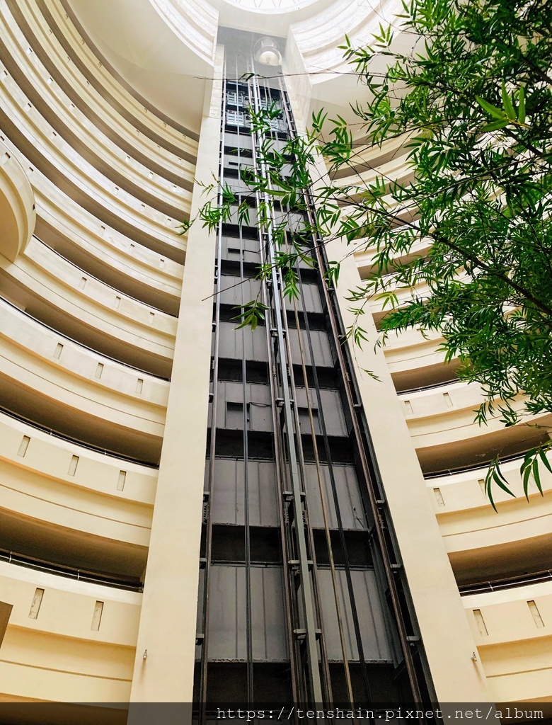 這是從24F豪華閣看透明景觀電梯,這兩座電梯只停1、10、24、38樓。搭乘透明景觀電梯,可以欣賞整個圓柱型天井的景觀和大樓自然採光的穹頂,相當漂亮。