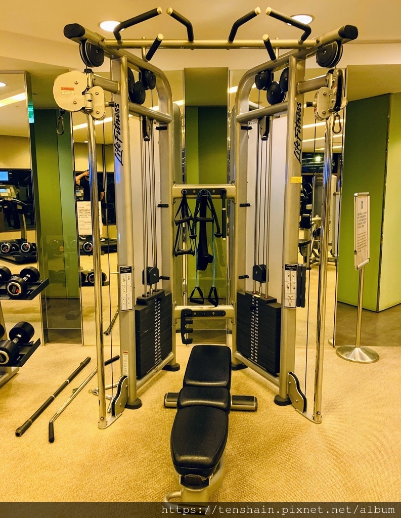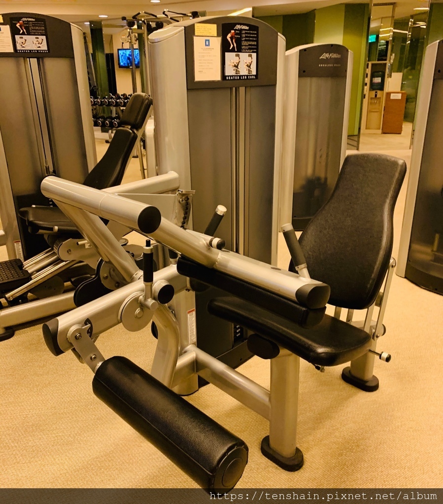 中間那個有個藍色軟半球的器材叫舉腿架,是我第一次在飯店中看見。不過,別擔心不會用,因為器材旁都有使用說明。