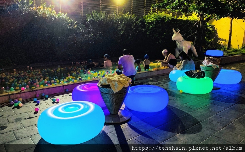 首先看到的是兒童戲水池,這裡是愛玩水的小朋友的快樂天堂,尤其是裡面還有一大堆不同顏色的浮球可玩。夜晚時,爸爸媽媽帶著小朋友一起玩,沒有了白天的熾熱陽光,玩起來更舒服,旁邊五顏六色的圓形座椅也非常漂亮。