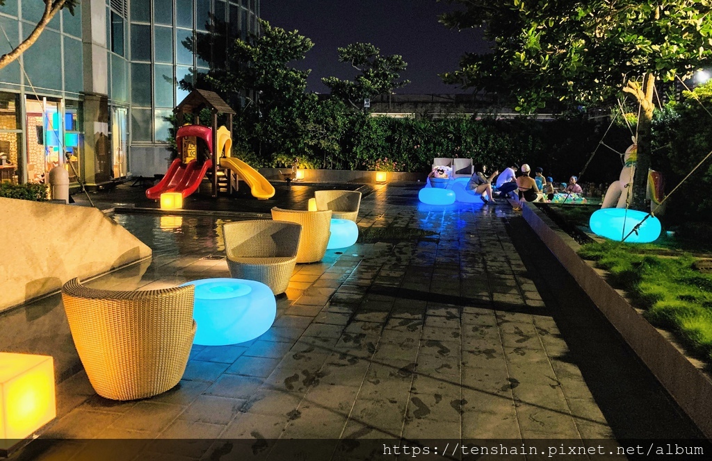 這裡也有休憩的座椅,即使不游泳,也可以和家人、朋友或是另一半在露台上一面聊天,一面享受清風拂面的快意。當然也可以欣賞台南的夜色,尤其到了中秋月分外明的時候,在此欣賞月色一定很適合。