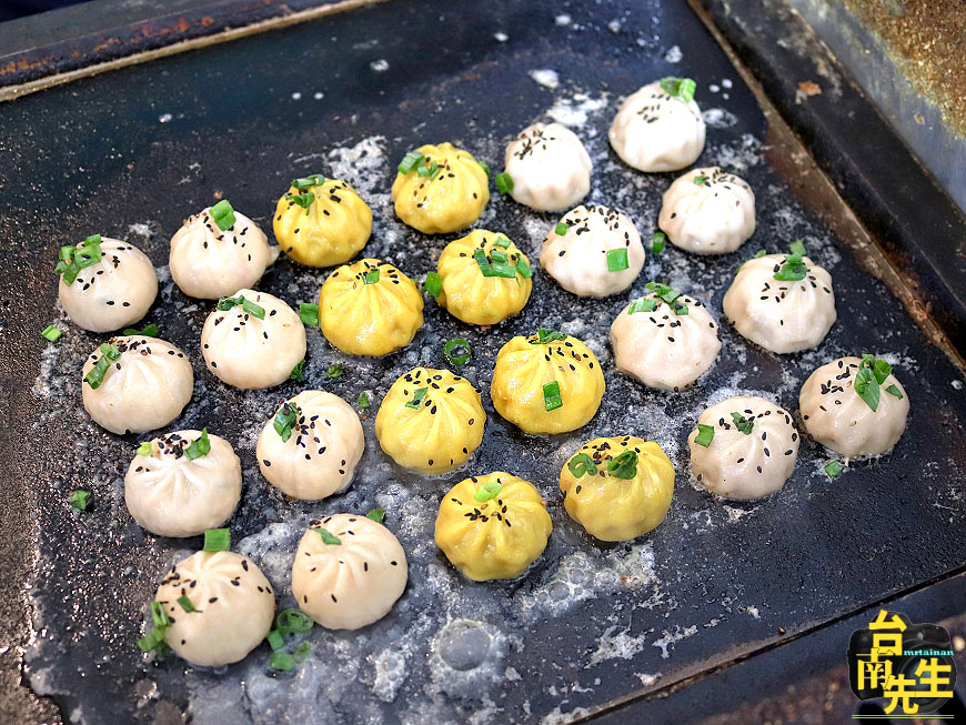 生煎包現點現煎,表皮灑上黑芝麻與蔥花,每份8顆