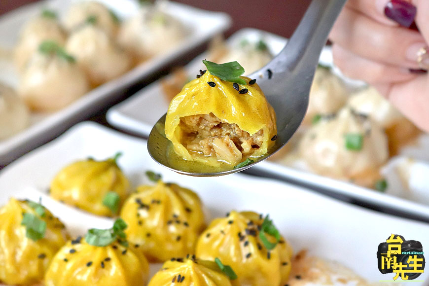 咖哩生煎包:特別加入咖哩粉製成咖哩色外皮,從裡到外都是滿滿的咖哩味