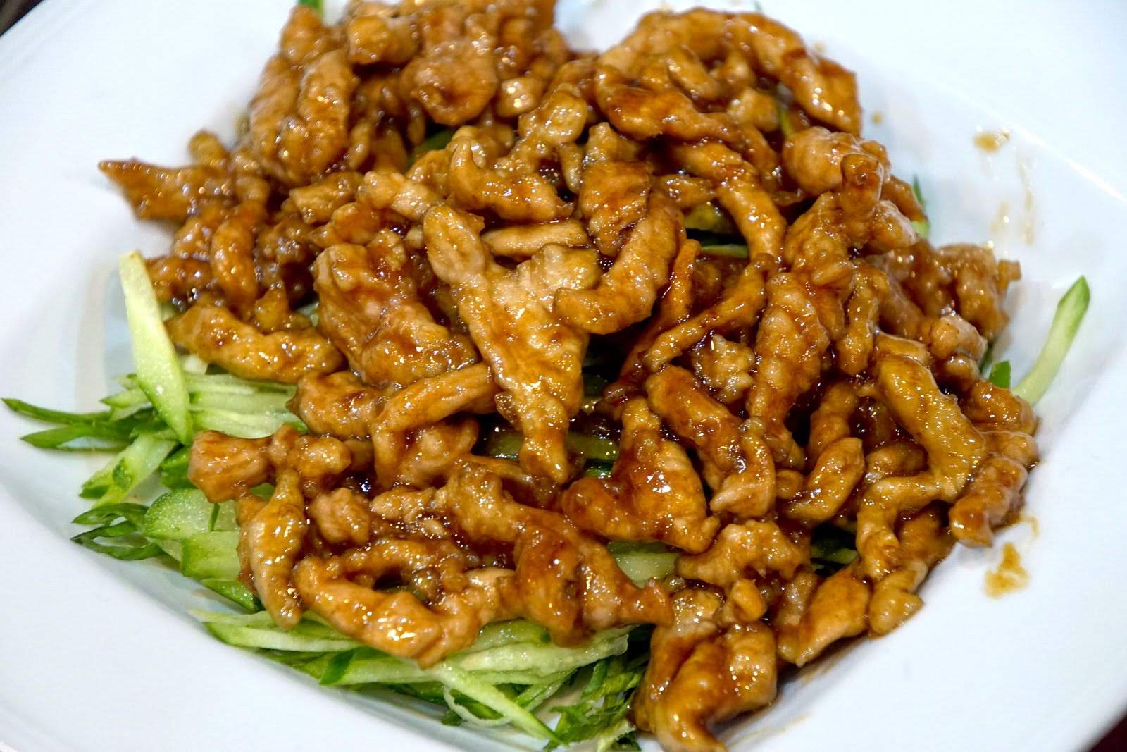 京醬肉絲 NT. 198,以甜麵醬爆炒的肉絲料理,吃起來鹹甜適中,是相當下飯的菜色,用烤鴨的餅皮包著吃也十分合適