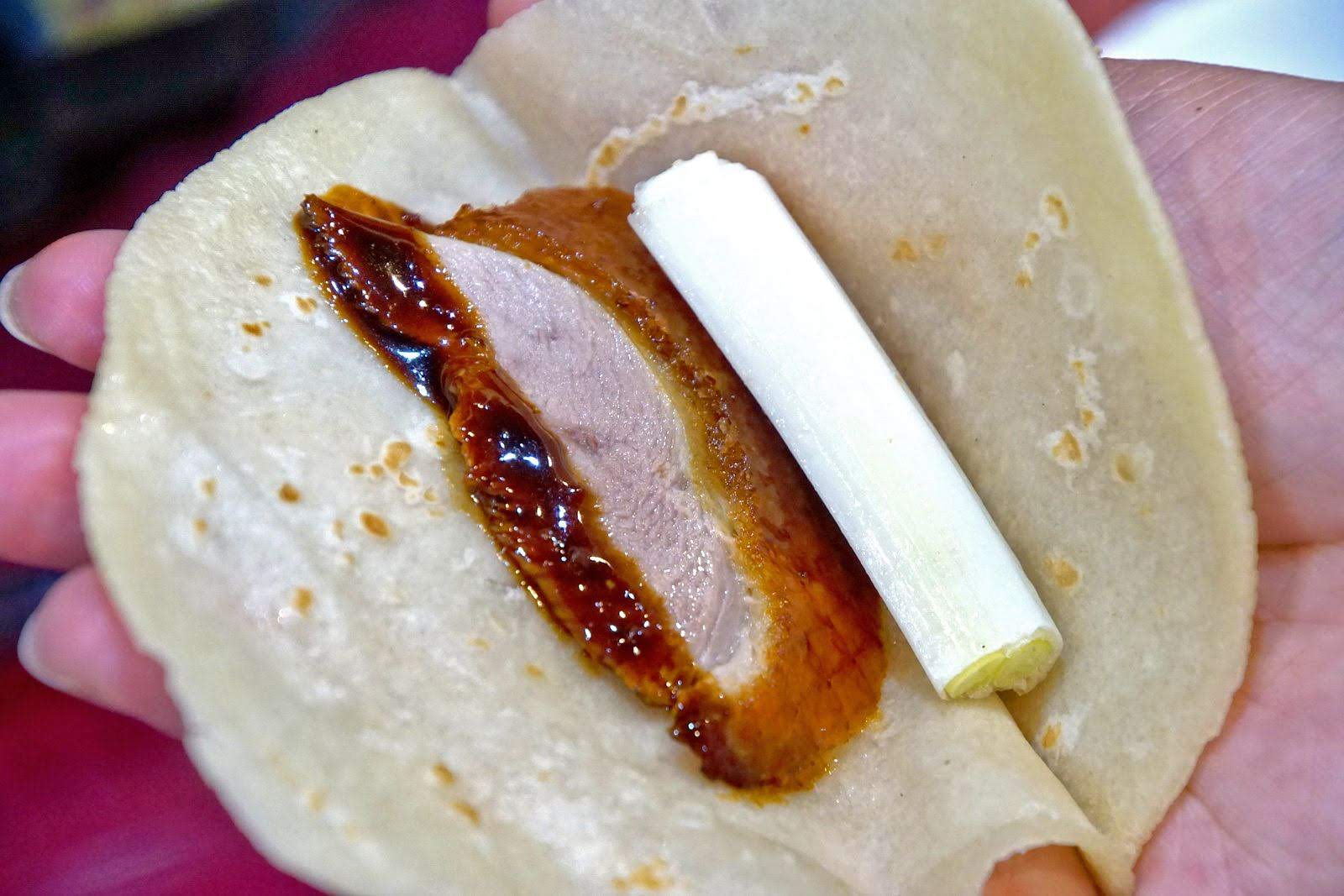在餅皮內放入片鴨,塗上一些甜麵醬後再放些大蔥