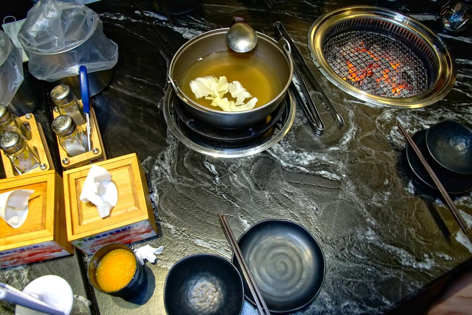 入座前,烤爐、火鍋、調味料等物品都已準備好在桌上,還貼心地準備了剪刀可以使用