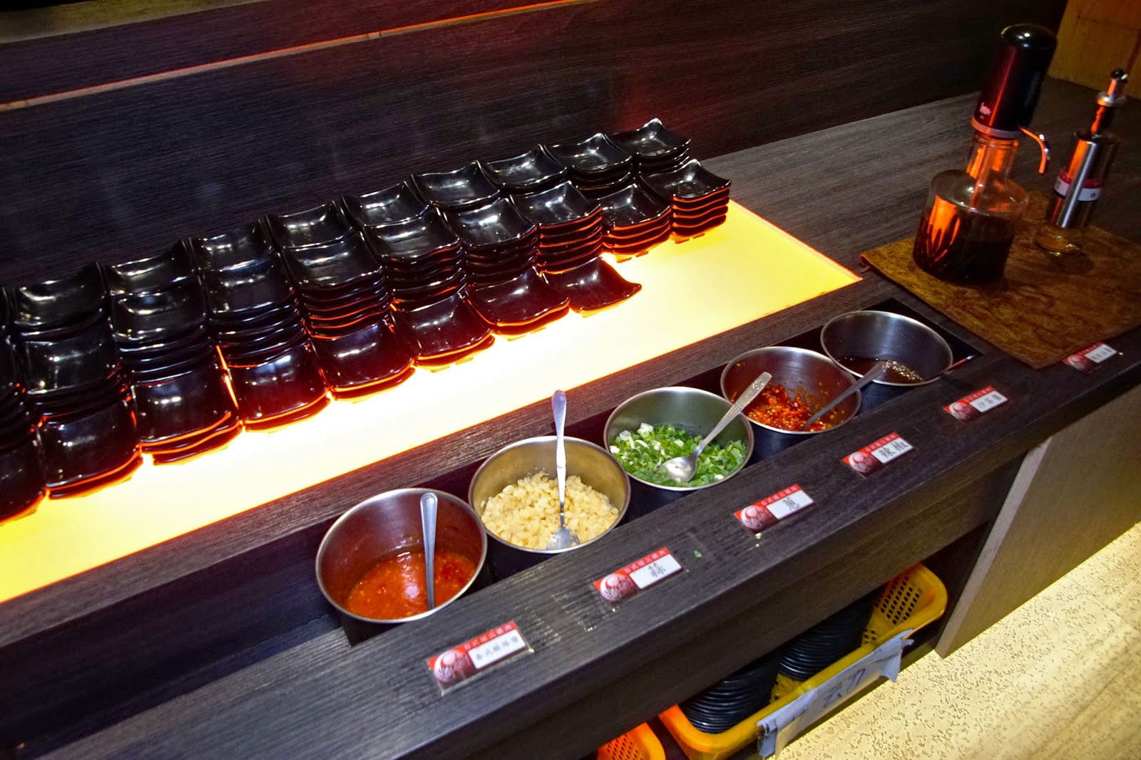 醬料區,有泰式酸辣醬、蒜、蔥、辣椒、沙茶醬