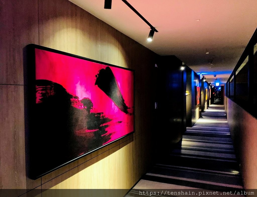 因為台南大員皇冠假日酒店的中央天井是由地平面直達酒店穹頂,所以基本上每一層的房間都是呈"口"字型公布。沿著長廊走向房間,牆面上掛滿的畫作,在投射燈的照射下,宛如畫廊一般,讓我們每一次進出,都好像在逛畫展一樣,充滿樂趣。