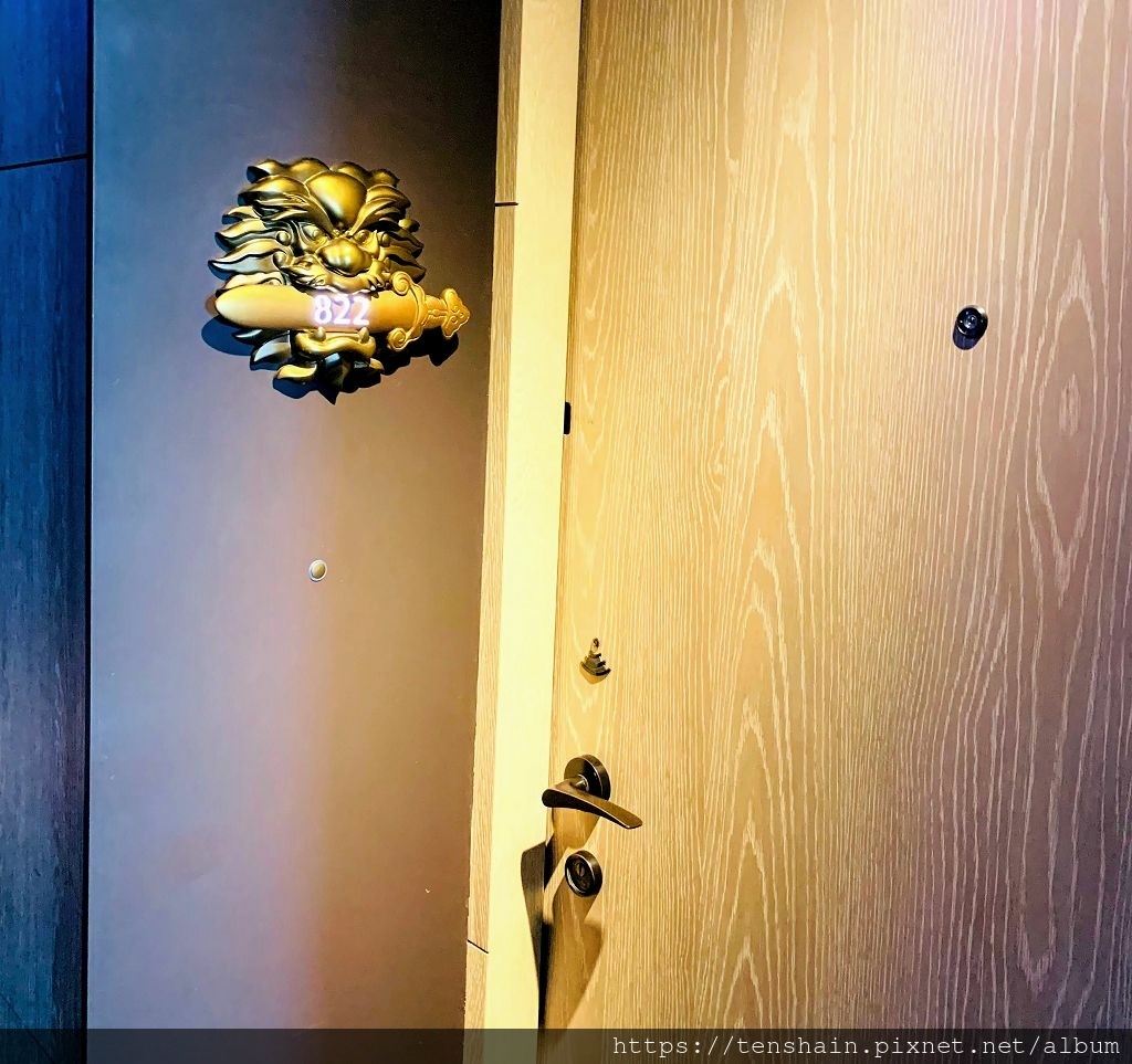 房間門口的設計也很創意,劍獅咬劍的門牌頗有意思。因為劍獅咬劍可是有學問的,面對劍獅,劍柄在右,代表祈福;劍柄在左,代表避邪;若劍獅咬雙劍,則是代表止煞鎮宅。台南大員皇冠假日酒店的劍獅咬劍,劍柄在右,所以代表祈福,住酒店也可以長知識,不錯吧!安平老街的特色,就是巷弄中有許多別具特色的劍獅,所以用劍獅咬劍來做門牌,就是將安平的特色巧妙的融入酒店的設計中。