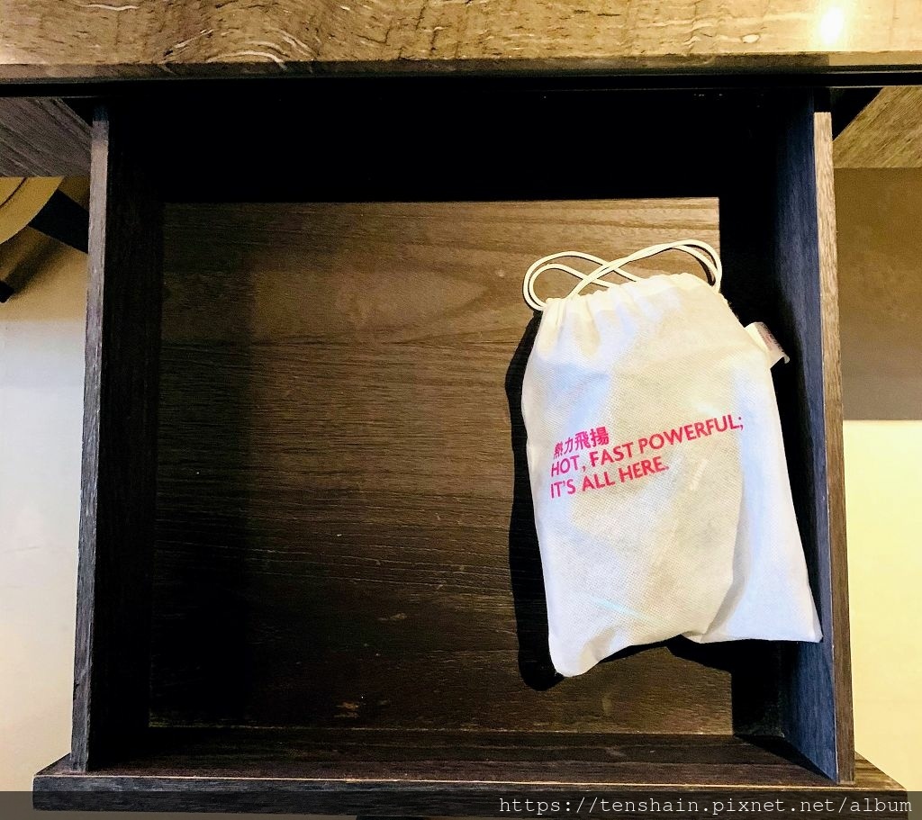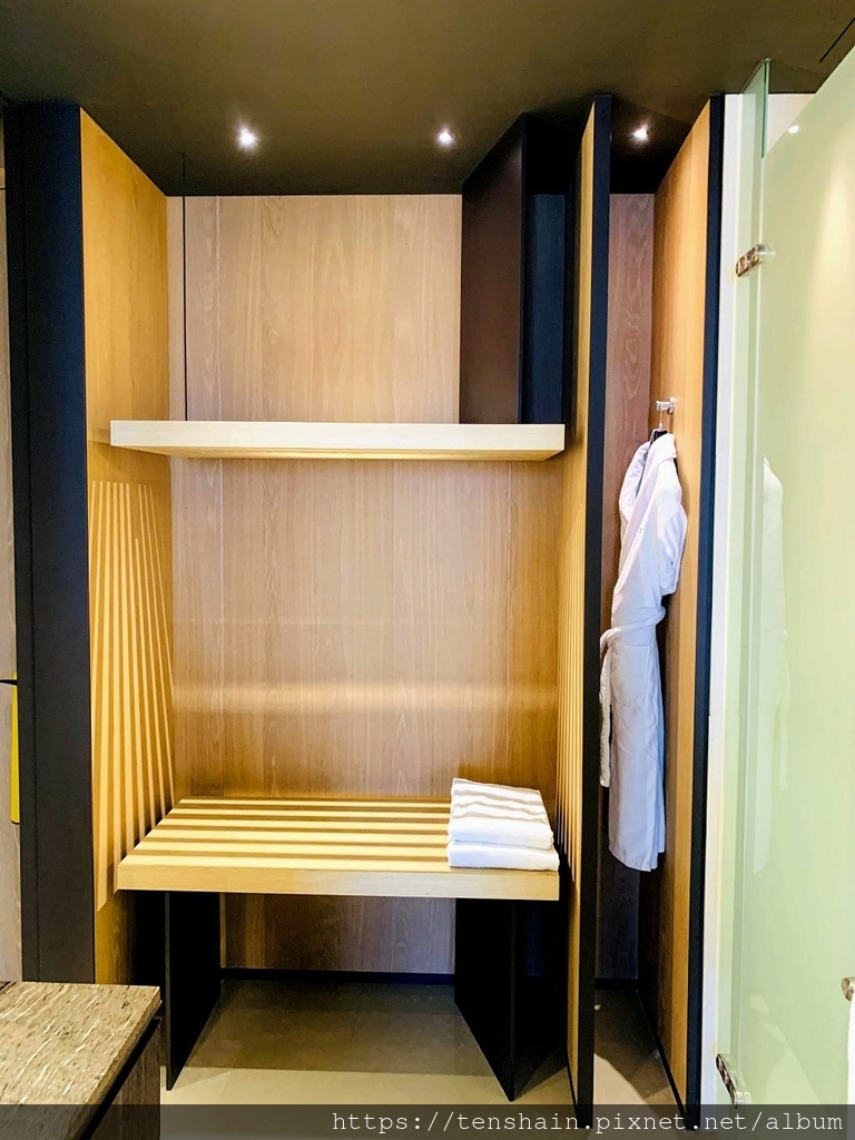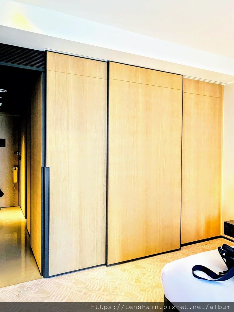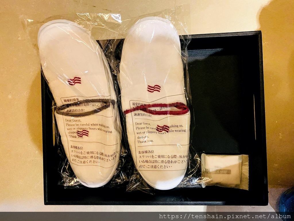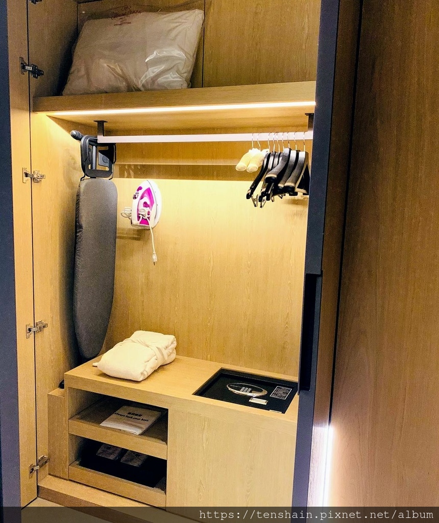 衣物櫃最下層有兩雙又軟又厚的室內拖,而且還是少見的包頭式設計,上面還有酒店的 LOGO ,穿起來很舒服。不過,若是 LOGO 能像林酒店一樣有雙色設計更好,因為可以防止穿錯另一半的拖鞋。