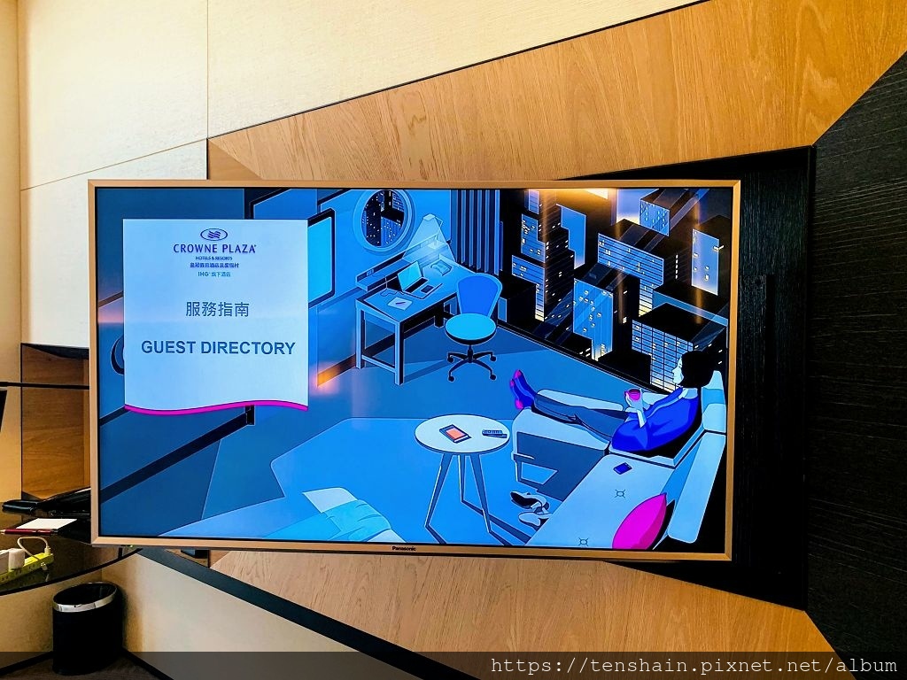 我們進門時,電視就是開著的,畫面出現的是服務指南,這是五星級飯店的趨勢,讓房客不用再去翻厚厚的書冊,就能知道酒店提供的服務有哪些。