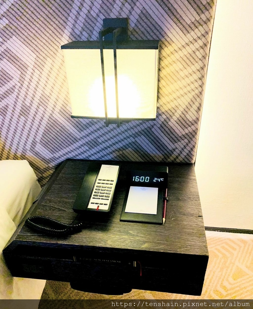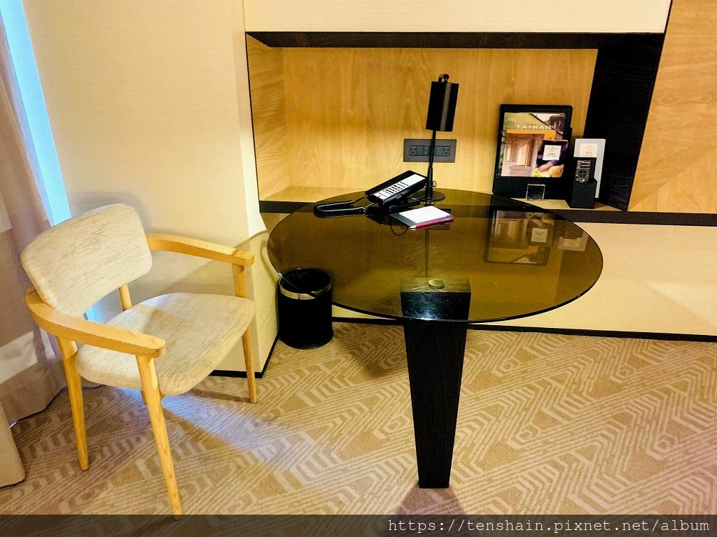 現代感十足的桌子,可惜面積有點小。美中不足的是電話似乎沒有好好清潔,我在打電話到櫃台詢問事情時,發現聽筒不太乾淨。