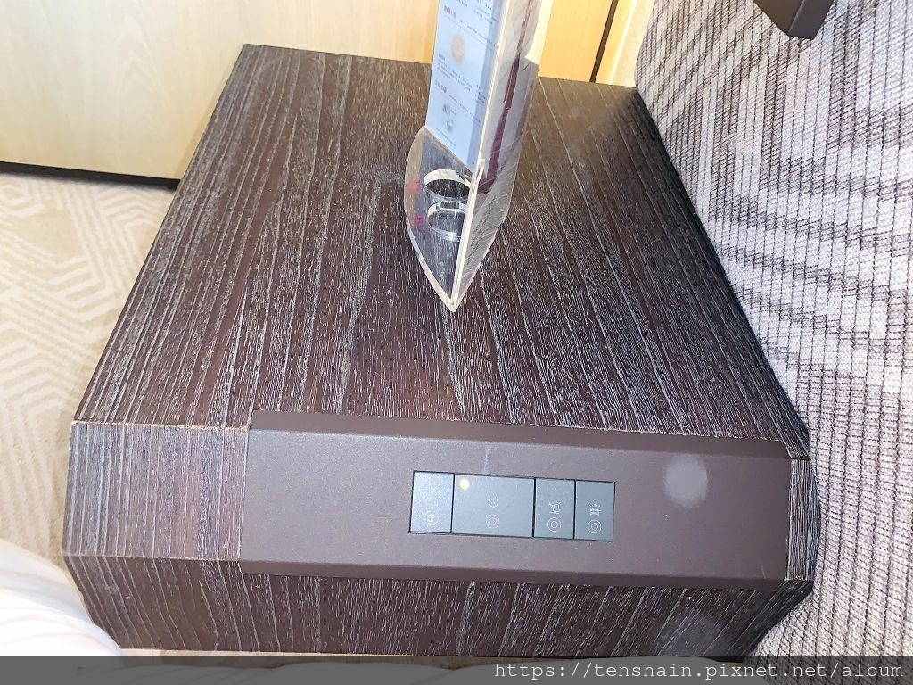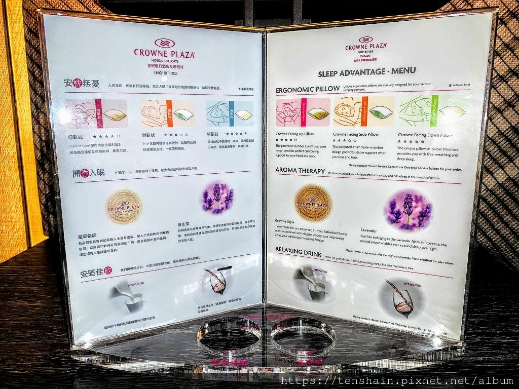 從床頭櫃上的立牌得知酒店提供三種幫助旅客入睡的服務:第一種服務叫安枕無憂,酒店備有三款安枕無憂獨特睡姿枕,有仰臥枕、側臥枕、俯臥枕。第二種服務叫聞香入眠,兩款薰香精油,助您聞香入眠,分別是薰衣草精油和皇冠格調精油。第三種服務叫安睡佳飲,兩款助眠安睡佳飲服務,紅酒每杯 260 元、溫熱牛奶每杯 90 元。