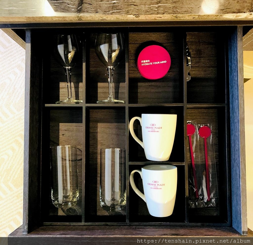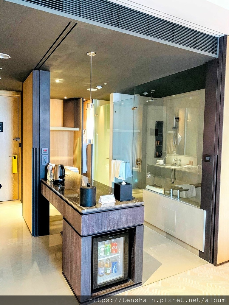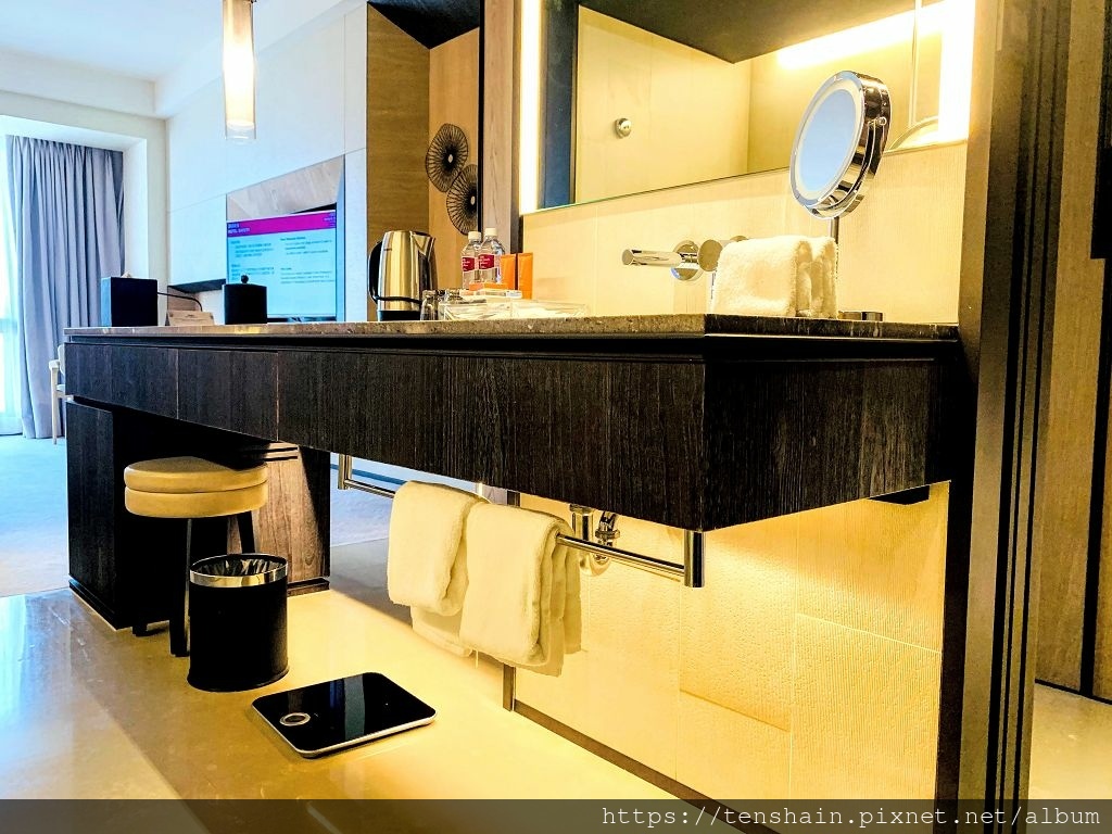 現在的廚房流行做中島,沒想到連房間也有中島了!從這個角度看過去,是台南大員皇冠假日酒店房間裝潢最讓我驚豔的設計,設計師巧妙的利用中島,把 Mini Bar 和洗手台結合在一起,讓整個房間的格局充滿生動的變化。
