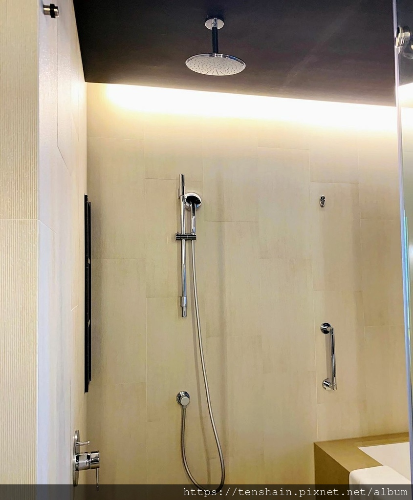 淋浴柱設在浴缸的旁邊,天花板上有花灑。雖然今年台南缺水,但是洗澡的水壓沒有受到影響。