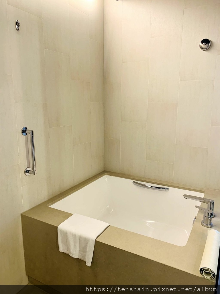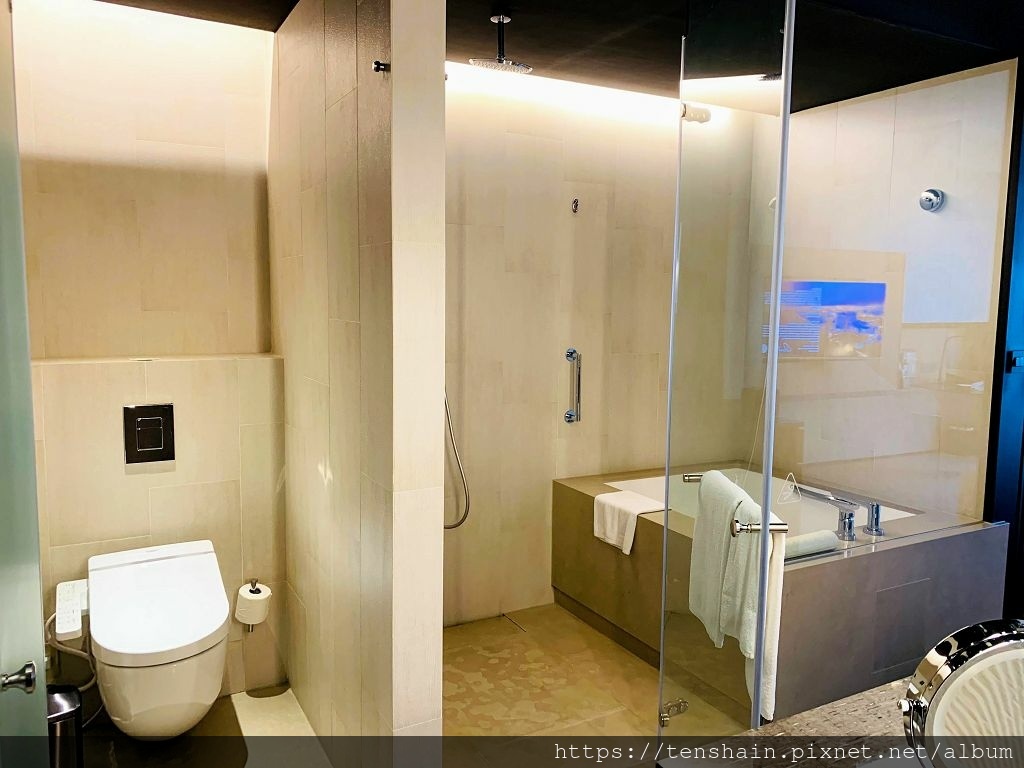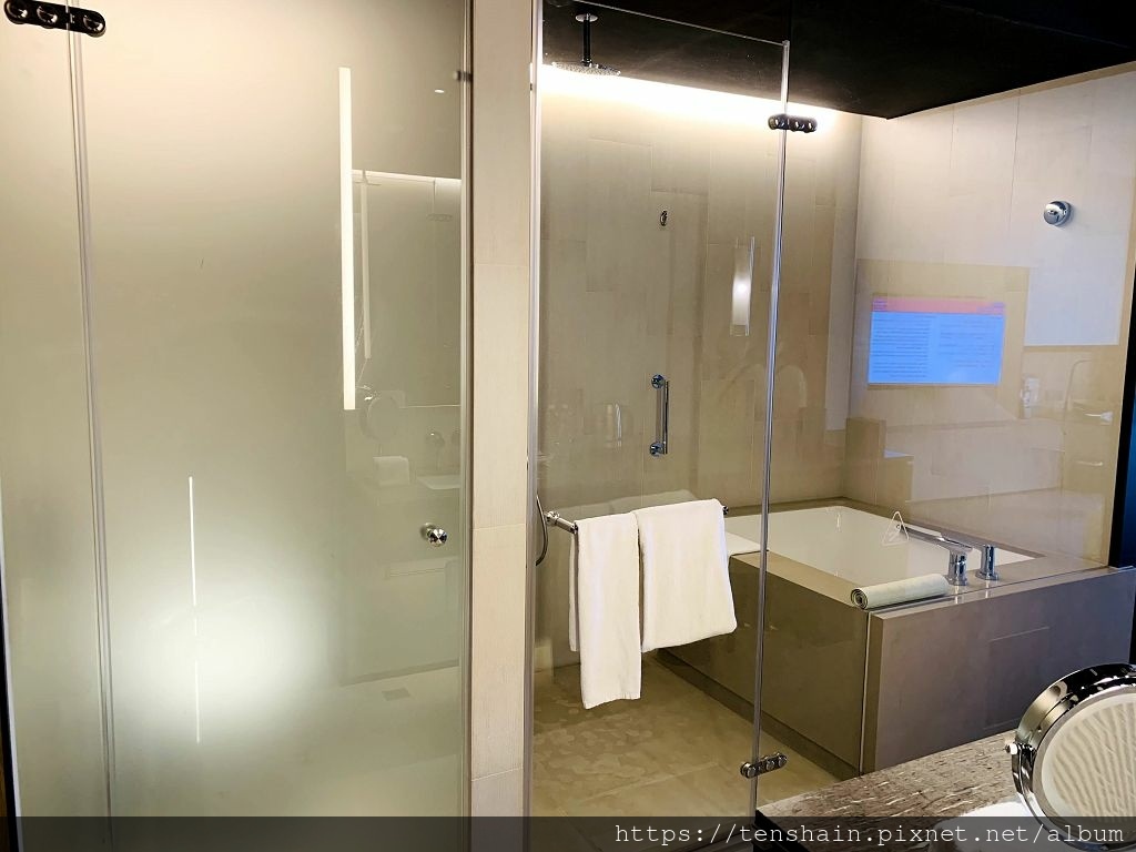 MAGIC!魔術時間到!前面說過,浴室的玻璃是透明的,難道每個人洗澡的時候都要歡迎參觀嗎?當然不!台南大員皇冠假日酒店不同於一般飯店會在透明浴室設計拉簾,而是改用隱藏式拉門來代替。隱藏式拉門有三個部分,如果全部拉起來,就會變成照片中的樣子,就好像房間中多了一個獨立的小房間一樣,真的是非常妙的設計。