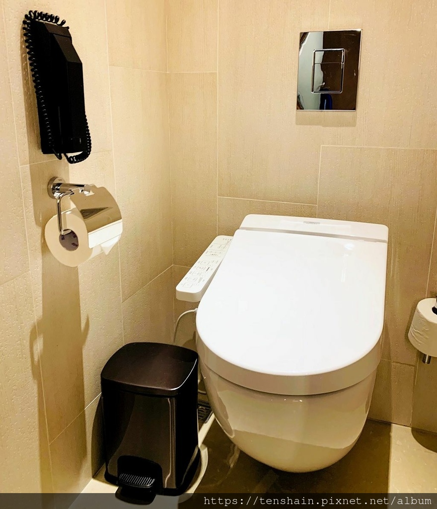 懸掛壁吊式的馬桶,沖水鈕在牆壁上, TOTO 的免治馬桶蓋還不錯。