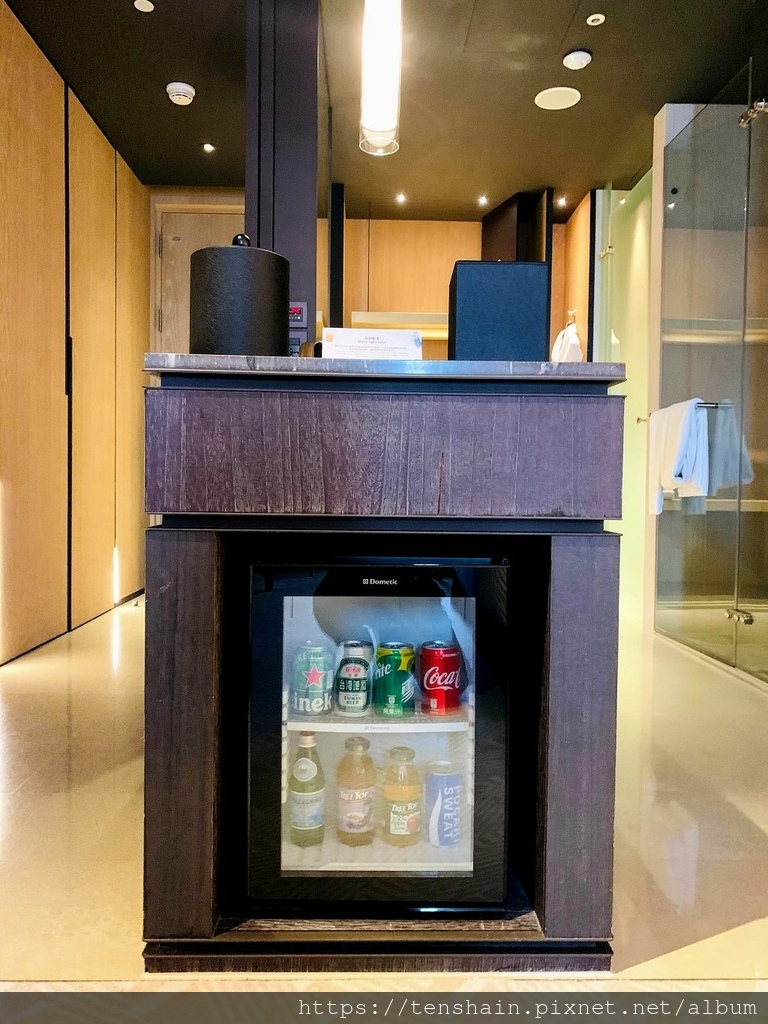 中島前端下方有個透明門的小冰箱,裡面的飲料全都是要額外付費的,問題是價目表藏在抽屜裡,可能會導致一些人誤會。另外還有一個問題,冰箱幾乎被付費飲料塞滿了,如果房客有自己的東西需要冰怎麼辦?我猜只能把裡面的飲料搬出來,隔天退房時再冰回去。但是這樣會不會影響飲料的品質?個人是抱持懷疑的態度。