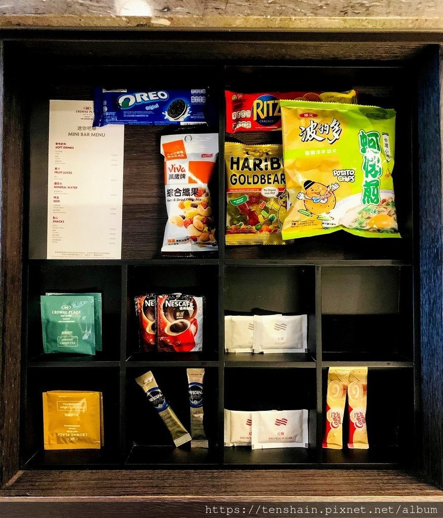 中間抽屜可以分成兩個部分,上面大格子放的零食都要另外付費;下面小格子裡的東西則是免費,因為已經包含在房價裡了。