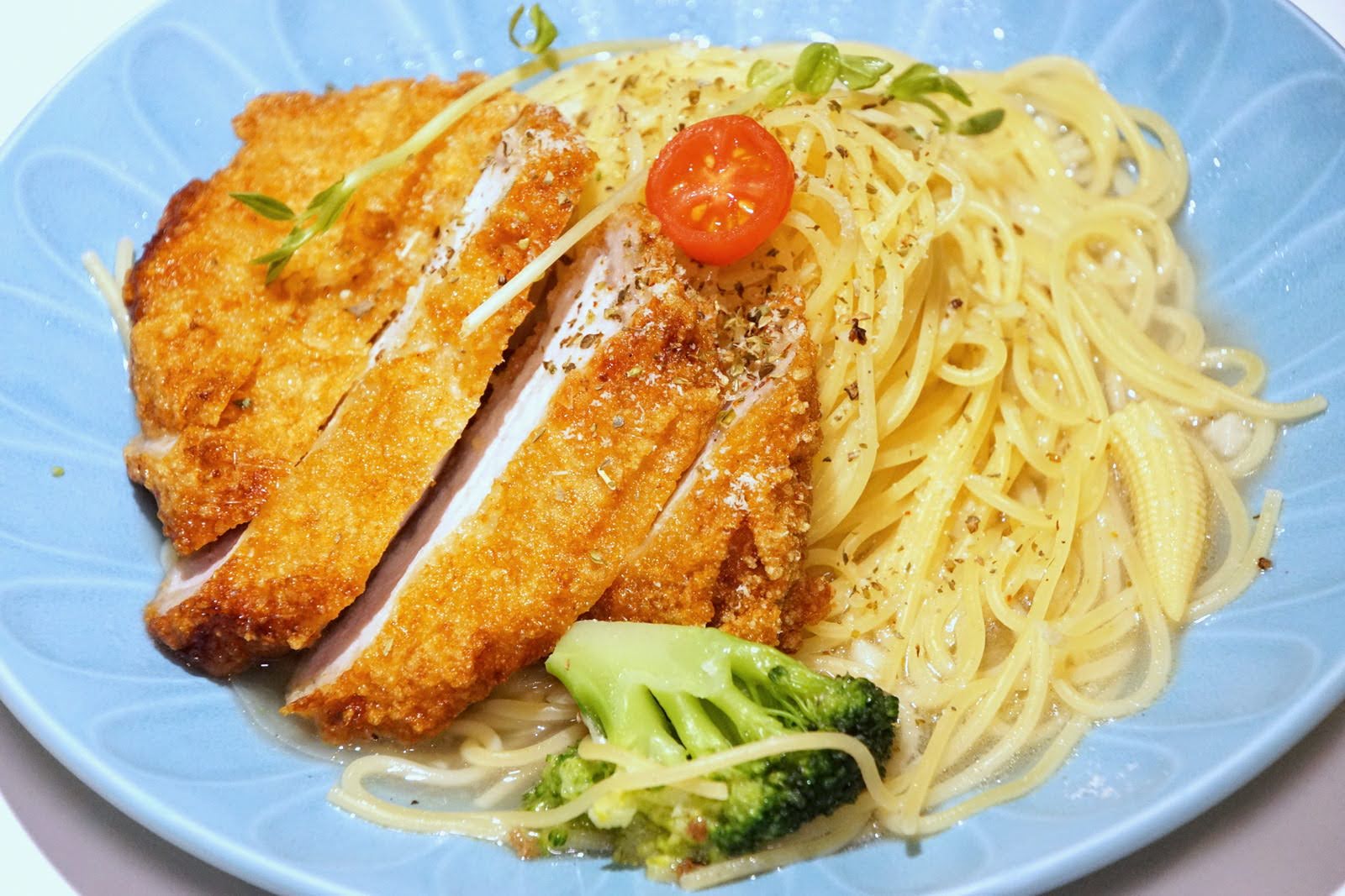 豪邁厚切豬排(蒜香)NT. 200,清炒蒜香麵加了炸豬排,份量會讓食量小的女生吃得很飽