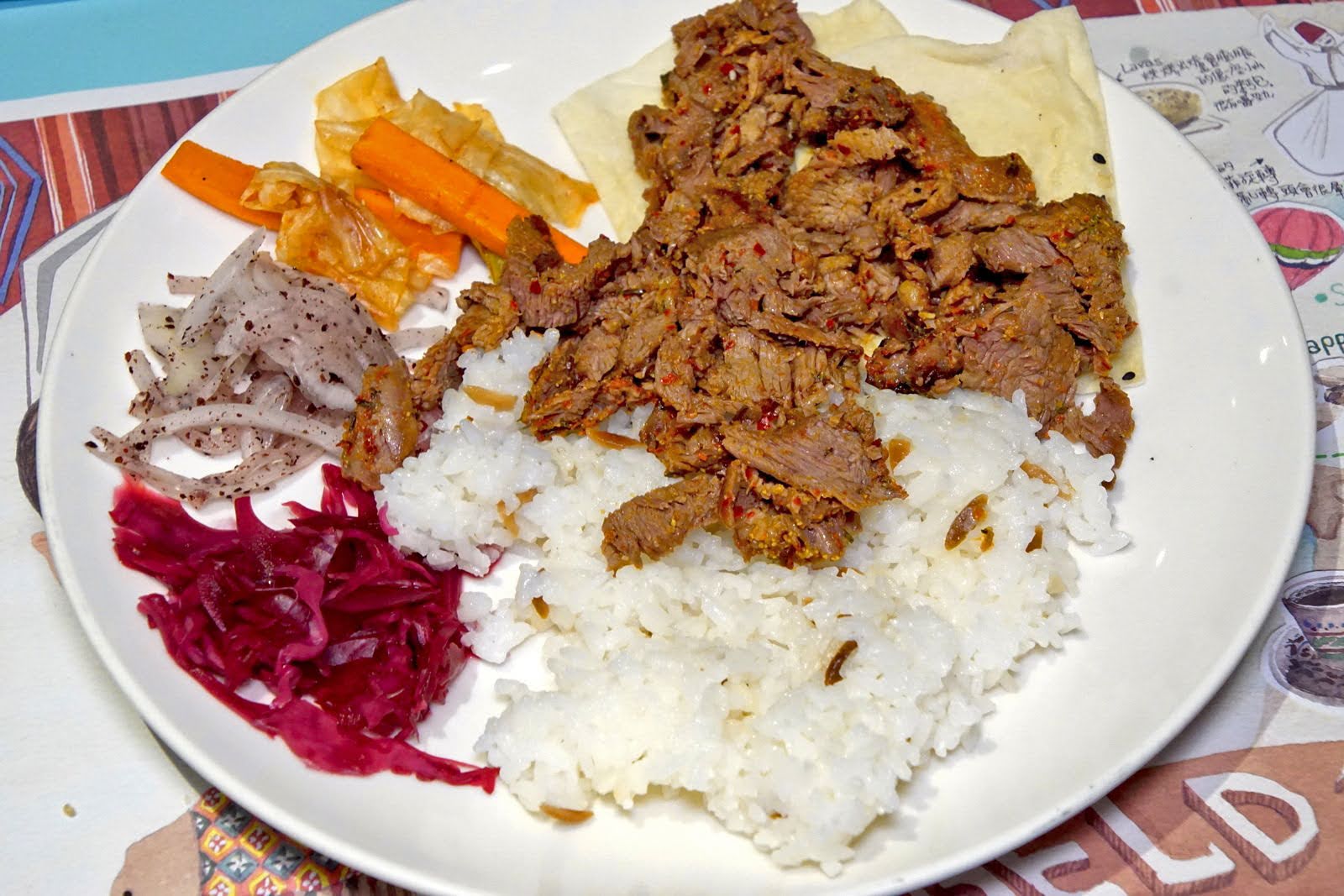 牛肉沙威瑪(飯),與常見的麵包版本不太一樣,這裡是配著白飯一起出餐。主菜是烤牛肉,吃起來有著濃厚的香氣
