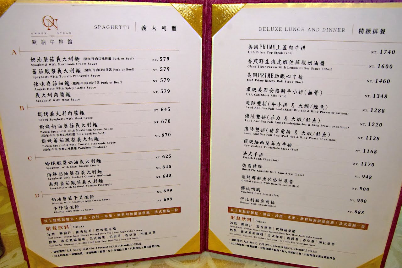 這裡要講古一下。早期的歐納義大利麵只有午餐可以點,等於是商業午餐,價格也比較親民。不過現在晚餐和假日都可以點了,當然價格也水漲船高。(本菜單為2021/8月份的版本,可能與您現在看到的不同)