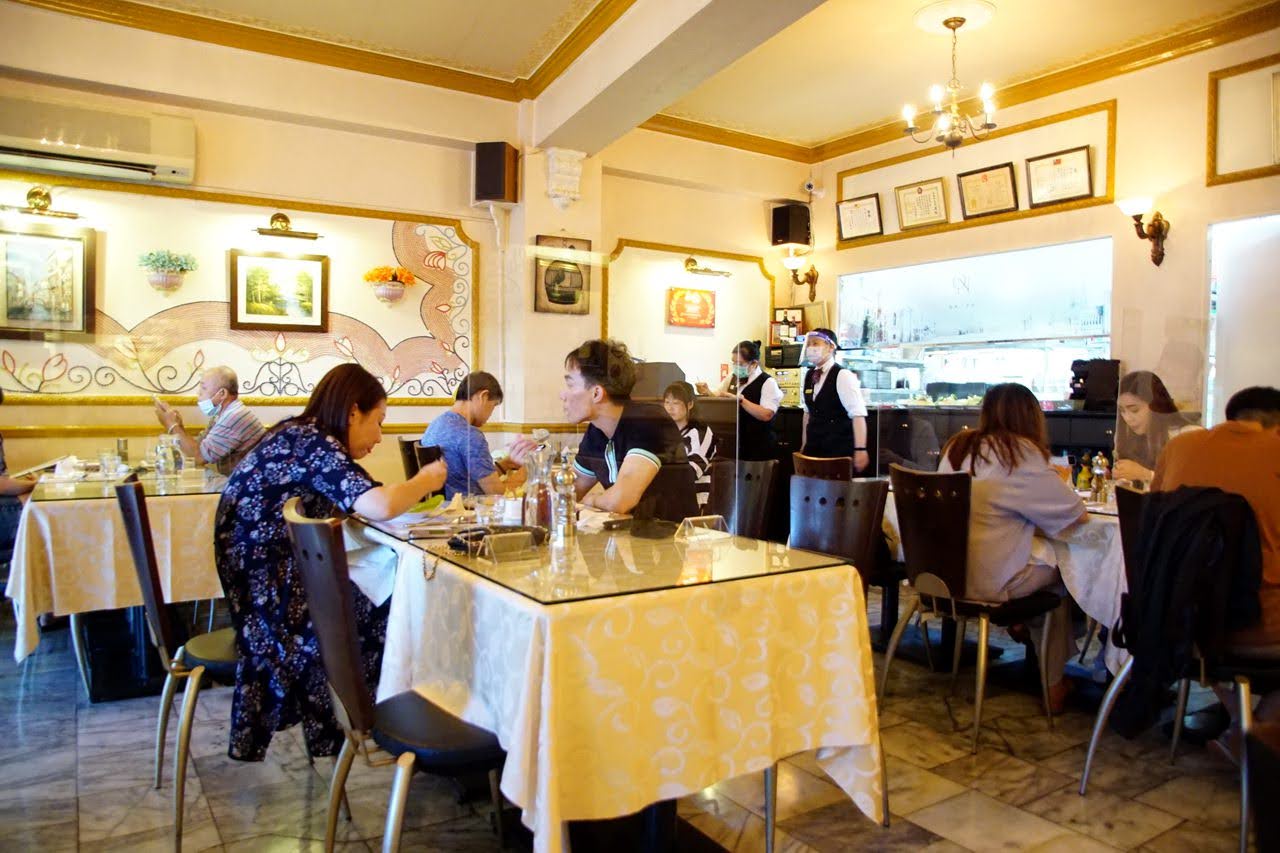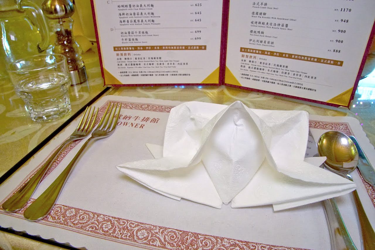 內部風格走老派路線,就是大家爸爸媽媽、甚至阿公阿嬤時代的感覺20幾年來都沒有變過,可以說是另一種特色吧!做座餐巾紙、餐具都已經備妥。入座後服務人員會開始加水以及送上菜單。