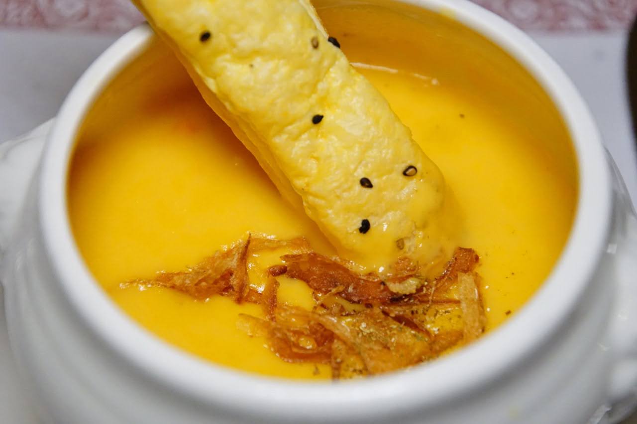 南瓜濃湯濃郁而不膩,用酥皮麵包棒沾著吃真是相當合拍。不過,雖然濃湯可以無限續加,但酥皮麵包棒就不行囉。
