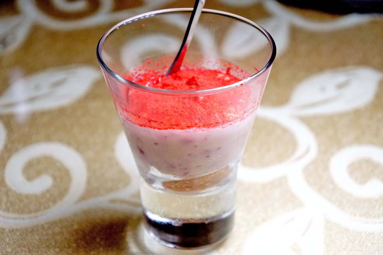 飯後甜點二號,莓果提拉米蘇。顏色相當繽紛的甜點,但記憶點沒有巧克力來得深刻,算比較中規中矩的附餐。