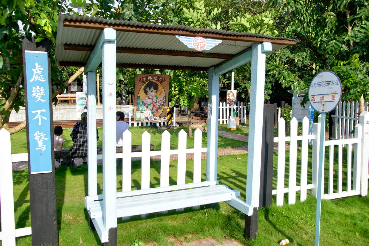 除了園內十分仿真外,園外的電線跟上也與真實的車站一樣漆上了「車站」的字樣。連大台南市公車也有站牌,不過這個站牌可是真的3路公車會行駛過來喔。