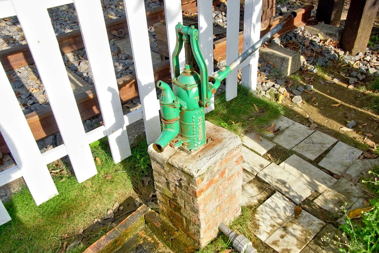 雜貨店前也有一處平交道,而平交道前設置了手壓泵浦。
